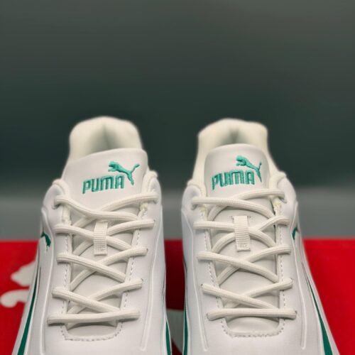 Premium look ke sath stylish Puma white sneakers jo modern aur sporty design offer karte hain. Pure white upper ke sath black side detailing aur glossy black heel support is pair ko classy aur premium appearance deta hai. Soft inner cushioning aur lace-up fitting ki wajah se yeh shoes long-time wear ke liye comfortable rehte hain.